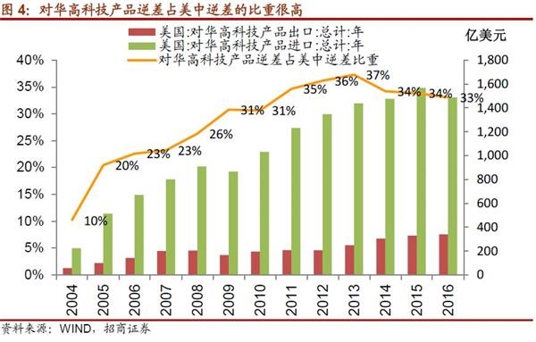 从下图可见,近年来美国高科技产品逆差在其总逆差中的占比持续上升,目前维持在10%以上的水平,2016年为11.1%,而美国高科技产品逆差中对华部分的占比在2016年为138%,这意味着美国对其他国家的高科技产品出口整体为顺差,而对中国却存在着大规模的逆差,对中国出口限制的严格可见一斑,而中国已成为美国高科技产品的最大供给商。而且,以美中的贸易逆差来考量,近年来超过30%的美中逆差是高科技产品的逆差造成的,而考虑到美国的比较优势,美国理应在此领域对中国有贸易顺差。