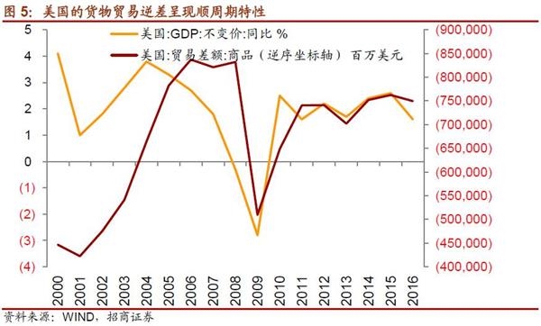 (2)美国的货物贸易逆差呈现顺周期特性,即经济增长的扩大伴随着逆差的扩大,因此逆差本身反映了美国经济发展的需求。