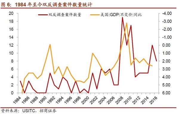 美国的贸易保护政策强度与美国经济增长反向相关。总体而言,金融危机后美国对中国的双反调查大幅上升,且在2015年之后更加严重;对比美国经济增长情况可见,贸易保护主义加剧往往伴随着美国经济低迷,有明显的逆周期性。在贸易保护早已开始且美国经济相对改善的情况下,激烈的贸易保护将以破坏增长和通胀为代价。