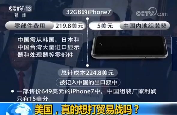比如说我们举一个例子,来看看事实是不是这样,我们就以大家都非常熟悉的内存为32G的iphone7,苹果手机为例,这个苹果手机他的总计成本是224.8美元,这个一个成本都被美国计入到了中国的出口额里面,可是你知道吗?在这样一个224.8美元的成本当中,只有5美元是我们内地的组装费,剩下的219.8美元,全部都是我们需要从各国,比如说韩国、日本、中国台湾地区大量来进口这些零部件,可是在售价649美元的这样的一个iphone7当中我们的利润只有多少,只有15美分,可是这些大量的成本都计入到了我们的出口额里面,所以对于中国来说是不公平的,那面对这样的一个问题,我们应该怎么样来解决,我们继续来请教周世俭教授。