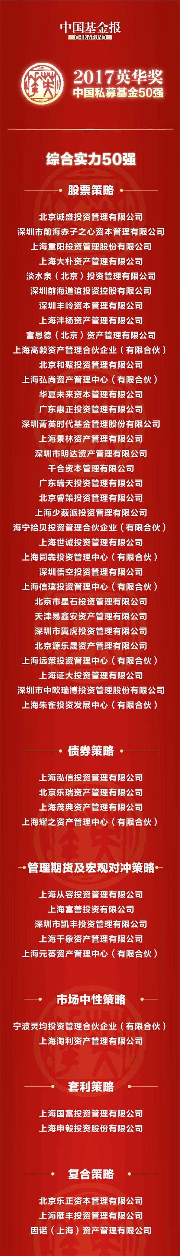 由中国基金报主办的英华奖2017中国私募基金50强评选今日隆重揭晓。50家六大策略私募基金公司,获评中国私募基金综合实力50强。
