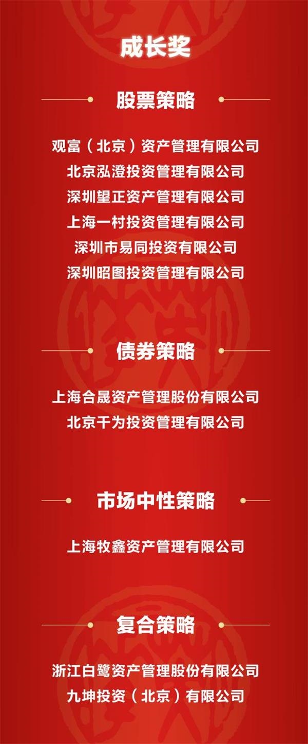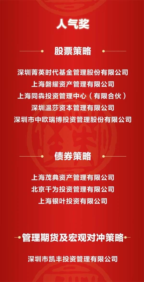 同时,11家私募基金公司获评中国私募基金成长奖,9家私募基金公司获评中国私募基金人气奖。53只六大策略私募基金产品,凭借过去五年、三年、一年的良好表现(截至2017年6月底),获评最佳私募基金产品奖。