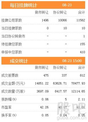 昨日新增挂牌企业10家,挂牌企业总数达到11562家,做市转让1496家,协议转让10066家,待挂牌总家数155只,申报中总家数达到410家。