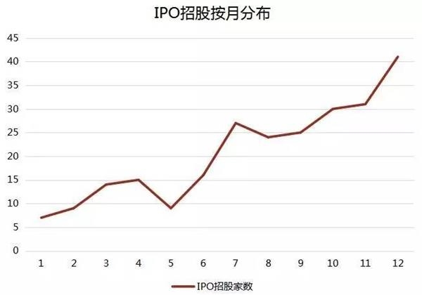 以IPO招股日计算,2016年招股新股数为248只。其中,12月份单月就高达41只,而年初的1月才7只。按月度新股招股数分析,全年IPO发行提速之势显而易见。