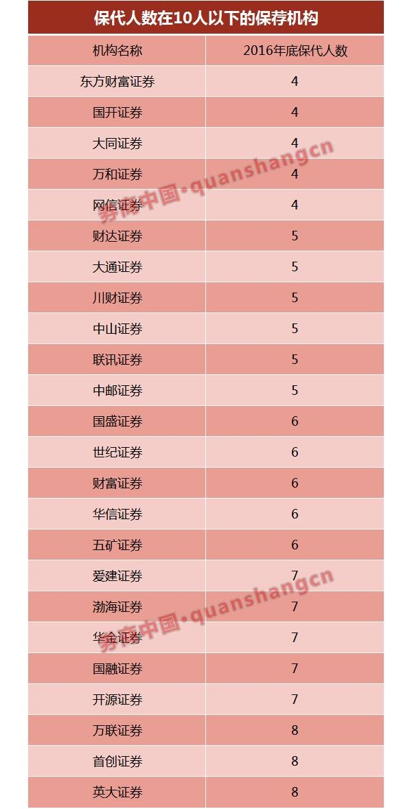 但保代数最少的保荐机构则刚刚达标监管最低要求,才4人,此类保荐机构数竟然有5家,分别为大同证券、万和证券、网信证券、国开证券和西藏东方财富证券。值得一提的是,大同证券、万和证券、网信证券去年才获得证监会保荐业务资格。