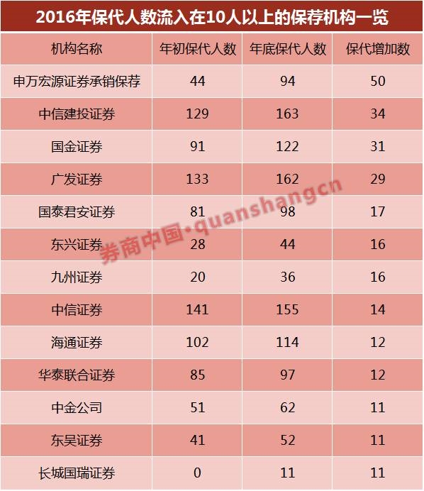 不仅如此,2016年尽管保代队伍整体在扩容,但各家保荐机构的保代人数增减也差异巨大。券商中国记者数据统计显示,2016年保代数量变动超过10人的保荐机构有13家,而此13家均为保代净流入。