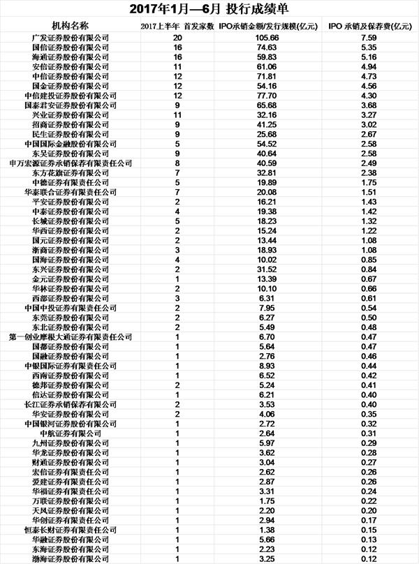 一单IPO业务,投行赚取不少。上半年国信证券通过一单IPO业务赚取1.12亿元,成为上半年单个IPO业务收费最多的券商;而兴业证券通过一单IPO业务,收费为1000万元,成为今年上半年单个IPO业务收费最少的券商。