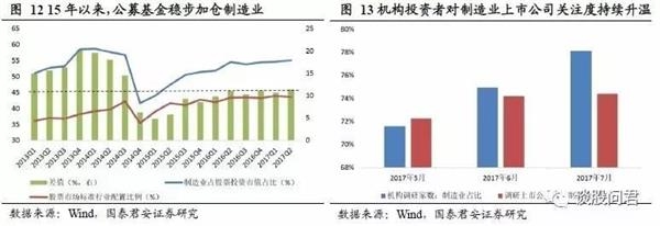 制造业公司业绩将进一步改善,布局正当时。受益于产能出清和全球朱格拉周期,制造业公司业绩有望持续改善。15年以来,公募基金稳步加仓制造业,近6个季度公募基金制造业配置比例与标准配置比例差值维持在10%左右,较上一轮高点仍有5%以上提升空间。另外,我们跟踪机构调研数据发现,近三个月机构投资者对于制造业公司关注度持续升温,布局大制造正当时。