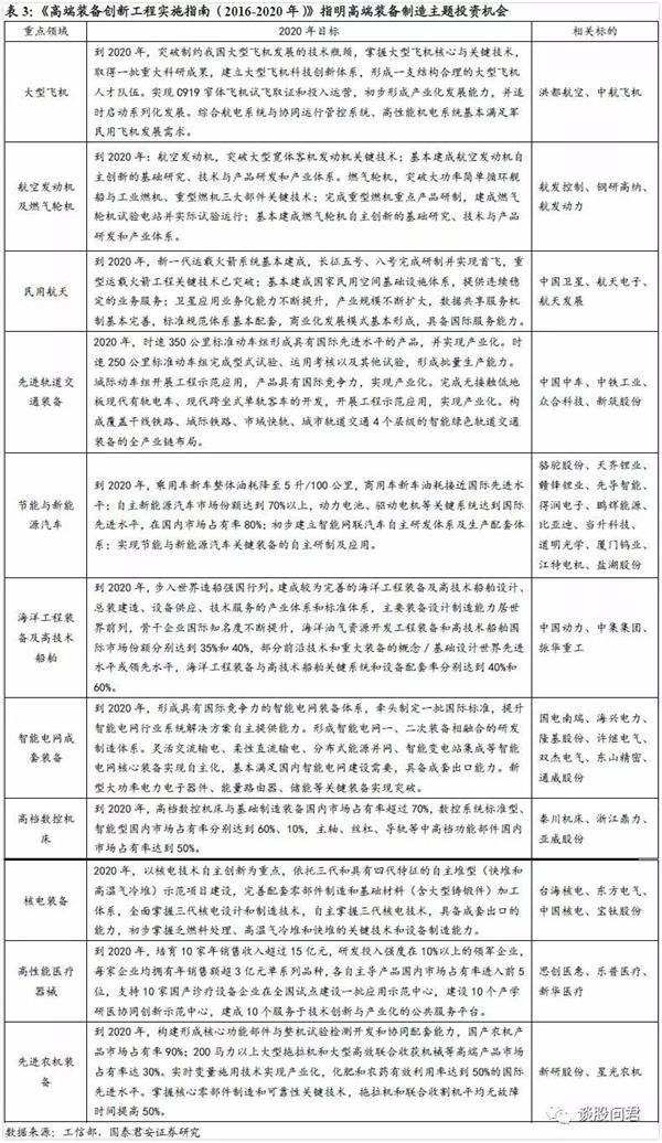 下表为我们梳理的高端装备制造业重点领域2020年发展目标及相关受益标的。综上,我们推出高端装备制造主题“皇冠明珠”组合。