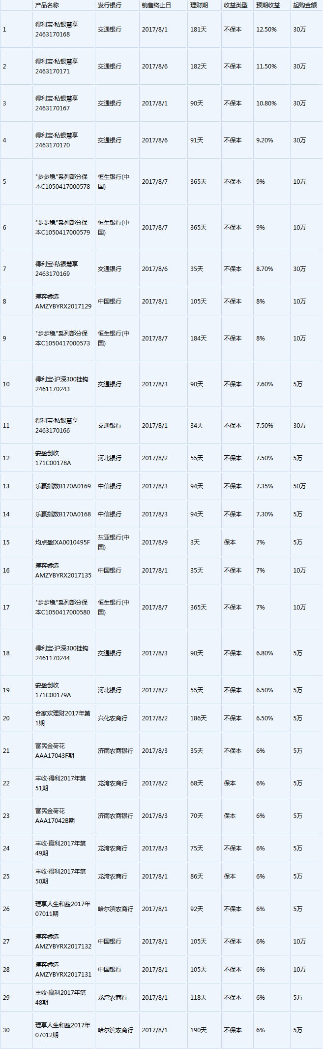 8月1日在售高收益银行理财产品一览