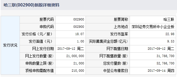 根据交易所公告,哈尔滨三联药业股份有限公司于2017年9月12日进行网上和网下申购。本次发行数量为5,276.67万股,占发行后总股本的25.00%,全部为发行新股,无老股转让。其中,回拨前网下初始发行数量为3,176.67万股,占本次发行数量的60.20%;网上初始发行数量为2,100万股,占本次发行数量的39.80%。本次公开发售股份后公司股权结构未发行重大变化,实际控制人未发生变更,不会对公司治理结构及生产经营产生影响。