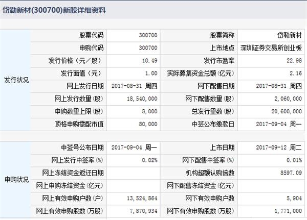 根据交易所消息,浙江台华新材料股份有限公司首次公开发行股票网上定价发行有效申购户数为15,259,234 户,有效申购股数为135,685,663,000 股,网上发行初步中签率为
