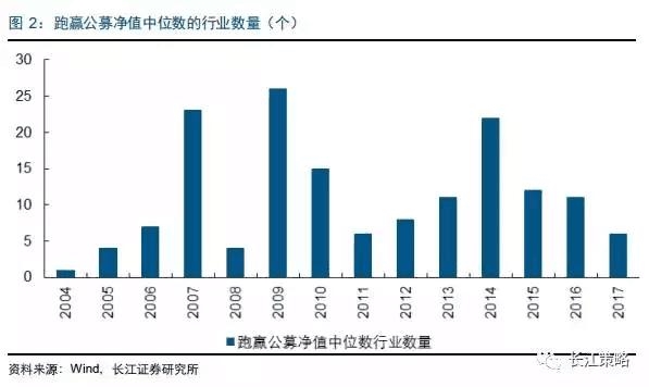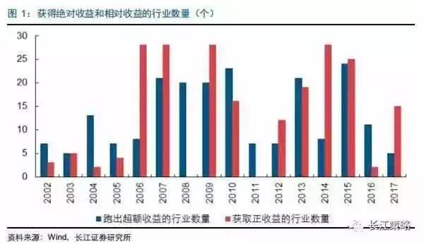 2017年初以来,统计28个申万一级行业,有15个申万行业指数录得正收益,却仅有5个行业跑赢了沪深300指数。这一结构性现象:正收益易VS跑超额难,自2002年以来,除了典型的牛市年份以外(2006、2007、2009、2014、2015)极为显见,历史上只有2012年曾经出现过此类结构性现象。
