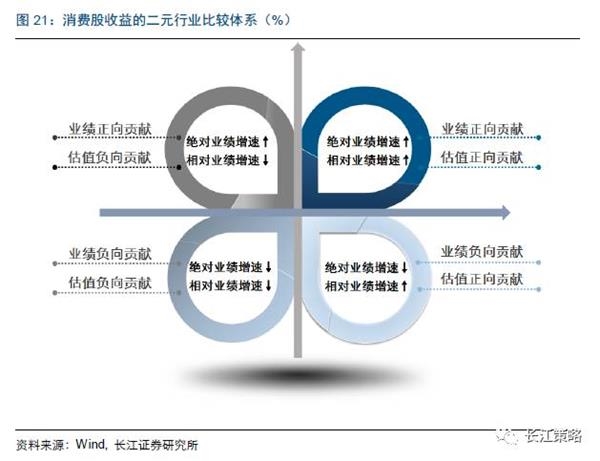 根据上文的分析,我们认为,消费股收益可以建立起如下的二元行业比较体系:绝对业绩增速决定业绩的贡献,相对业绩增速决定相对估值的贡献。根据这两个条件可以将消费股的情况划分为四个区间: