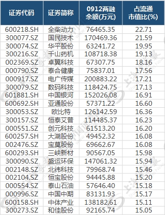 就两融余额占流通市值比来看,近八成的773只个股的占比高于2.18%的两市整体占比。其中,121只个股占比超过了10%,23只个股占比在15%以上(见下表),居前两位的全柴动力和国民技术的两融余额为76465.35万元和170469.36万元,占流通市值比为22.71%和21.59%。一般来说,两融资金以短线操作为主,两融余额占流通市值比大的话,说明短线资金介入较深,容易加大相关个股的波动幅度。