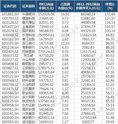 截至9月12日,两市两融余额为9783亿元,其中,沪市融资余额为5750亿元,占流通市值比为2.07%;深市融资余额为3986亿元,占流通市值比为2.37%;两市融资余额9736亿元,占流通市值比为2.18%。而一个月前作为本轮行情调整低点的8月11日,两市两融余额为9093亿元。也就是说,最近一个月两市两融余额增加了690亿元,增幅为7.59%,在22个交易日中日均增加31.36亿元。