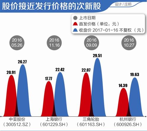 随着市场的迅速回调,多只新股价格距发行价已不远。比如中亚股份(300512.SZ)1月16日收盘价为26.27元,其发行价格为20.91元,相差仅25.63%幅度;上海银行(601229.SH)收盘价22.42元,首发价格为17.77元,相差26.17%幅度。三角轮胎(601163.SH)与杭州银行(600926.SH)亦接近发行价格,分别为33.71%、36.41%的距离。