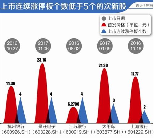 在他看来,一方面创业板估值过高,另一方面创业板中的新股泡沫化严重。据21世纪经济报道记者对2016年以来发行的新股表现统计来看,涨停板个数正逐渐减小。上市后涨停板低于10个板的共有56只股票,其中2016年下半年之后上市的股票达42只,占比75%。比如2016年11月16日上市的上海银行,与2017年1月9日上市的太平鸟(603877.SH)创下涨停板数新低,分别为2个、3个。