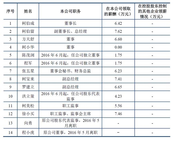 泰达新材招股书显示,核心管理层的平均年薪不足7万元,其中,2016年,泰达新材董事长柯伯成年薪为6.42万元、副董事长兼总经理柯伯留年薪为7.62万元、董秘兼财务总监张五星年薪为6.23万元,公司内部董事集及高管6人的平均年薪仅为6.82万元,独董每月2500元的津贴也低于一般水平。
