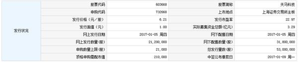 中国证券网讯根据交易所公告,福建天马科技集团股份有限公司于2017年1月17日起在上海证券交易所主板上市。公司首次公开发行不超过5,300万股,本次发行价格为6.21元/股,市盈率为22.97倍。股票简称为“天马科技”,股票代码为“603668”。
