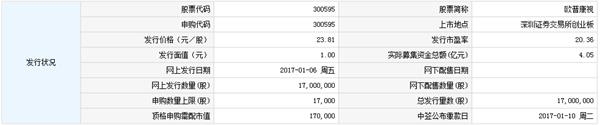中国证券网讯根据交易所公告,欧普康视科技股份有限公司于2017年1月17日起在深交所创业板上市。公司首次公开发行不超过1,700万股,本次发行价格为23.81元/股,市盈率为20.36倍,证券简称为“欧普康视”,证券代码为“300595”。