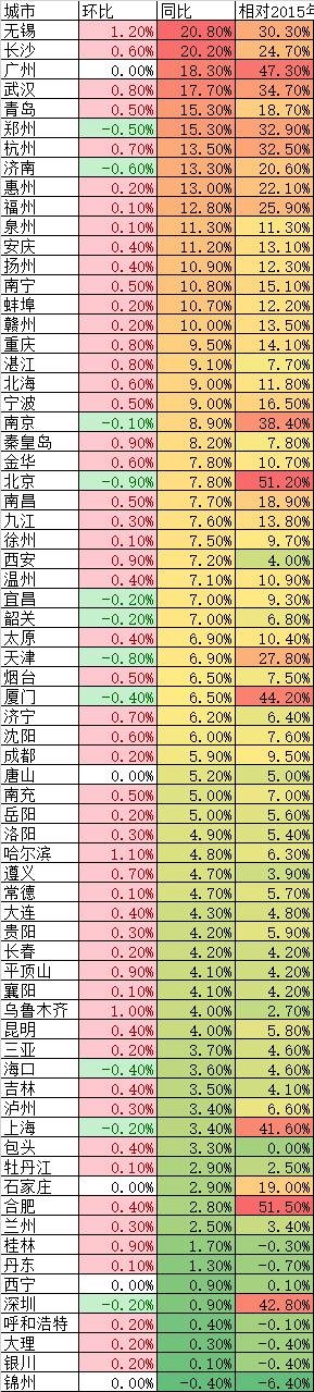 如果放到国家统计局70城二手房数据来看,也有同样情况,8月份的数据,多数城市房价不仅是同比上涨,环比也在上涨。下图来源是国家统计局: