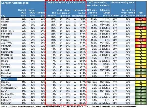 每日经济新闻记者注意到,下图是摩根大通根据美国每座主要城市年支付债务、养老金以及退休金占全年预算的比例来进行排名的。而这一排名的最终结果也让人大跌眼镜——知名城市芝加哥的风险指标最高,芝加哥具名60%以上税款将用于偿还债务和养老金,其次是达拉斯与菲尼克斯,以及匹兹堡。与此同时,还有十几座其他城市的年度预算中,超过50%用于为以往支出的维护成本提供资金。