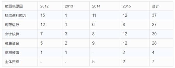 先通过表格来看一下从2012年到2016年被证监会否决的项目原因有哪些:
