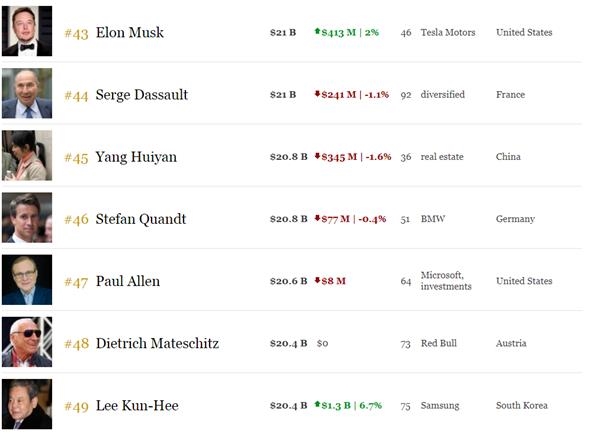 值得一提的是,目前马斯克的身家已经高于微软联合创始人保罗·艾伦(206亿美元,排名第47)和韩国首富、三星集团前会长李健熙(204亿美元,排名第49).