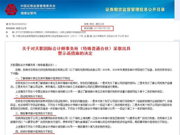 外界分析,叶慧在最后一关被淘汰,始于上市公司“恺英网络”财报审计问题。今年7月13日,福建证监局向恺英网络的审计机构天职国际会计所出具了警示函,警示函的内容涉及到恺英网络2015年、2016年的财报审计问题,负责审计的签字会计师正是叶慧。