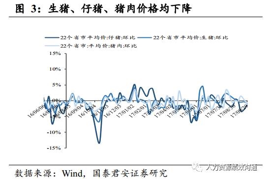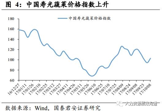 节前猪肉、鸡肉价格下跌。(1)9月23日至9月29日,猪肉价格方面,22个省市仔猪价格34.61元/千克,环比下跌1.34%。生猪价格14.4元/千克,环比下跌0.89%,猪肉价格21.3元/千克,环比下降1.16%。随着国庆中秋两节旺季过去,生猪需求将减少,再加上供给的增加,预计生猪价格下跌的趋势将持续。(2)受毛鸡出栏量较多影响,9月23日至9月29日,36城市平均鸡肉零售价为10.99元/公斤,环比下降0.18%。(3)受黄金周节假日影响,10月2日至10月8日,中国寿光蔬菜价格指数环比上升至103.1,环比上涨9.12%。