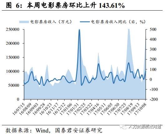 义乌小商品价格指数环比下降,电影票房环比上升。10月2日至10月8日,义乌小商品价格指数100.09,环比下跌0.27%,同比上涨0.07%。10月2日至10月8日,受国庆黄金周及中秋双节的影响,电影票房收入为22.43亿元,环比上升143.61%,同比上升81.42%;观影人次为6576万人,环比上升136.29%,同比上升64.15%。
