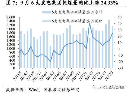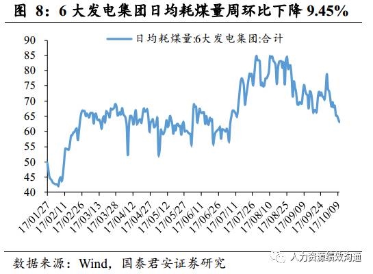 6大发电集团发电力度环比下降。10月8日,6大发电集团日均耗煤64.1万吨,环比下降9.45%(上周环比下降1.1%),同比上升12.64%(上周上升33.31%).9月份6大发电集团耗煤量2135.43万吨,同比上涨24.33% .