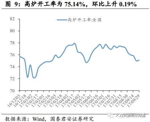 高炉开工率环比上升,螺纹钢价格上涨。(1)9月23日至9月29日,高炉开工率为75.14%,环比上升0.19%。(2)10月9日,螺纹钢(HRB400 20mm)价格4156元/吨,环比上涨1.81%;线材价格4446元/吨,环比上涨1.6%;热轧卷(板)价格4310元/吨,环比上涨2.99%。(3)期货方面价格,螺纹钢期货结算价格为3733元/吨,环比上涨3.61%;热轧卷(板)期货价格4030元/吨,环比上涨3.79%。(4)库存方面,10月8日,螺纹钢库存为453.74万吨(上周为418.19万吨),环比上涨8.5%,线材库存为134.87万吨(上周为117.52万吨),环比上涨14.76%,热轧卷(板)库存为215.26万吨(上周为193.26万吨),环比上涨11.38%。