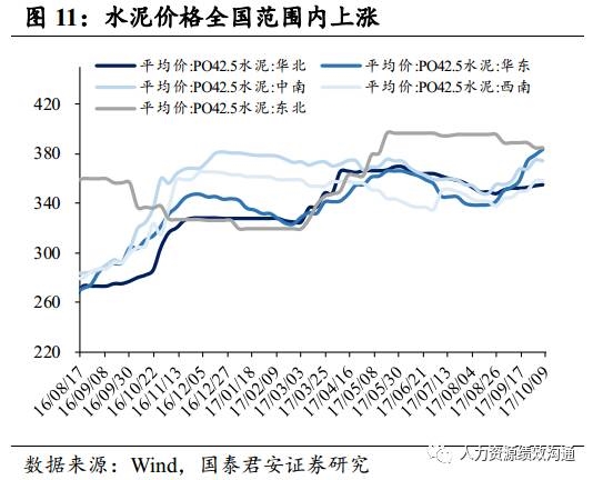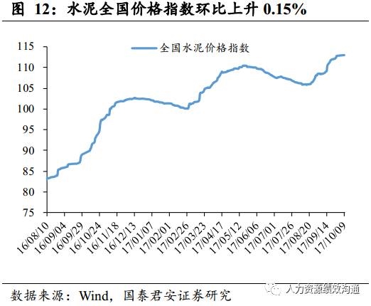 水泥价格指数、玻璃价格均环比上涨。(1)环保政策影响石灰石开采,熟料供应紧张,加上企业水泥库存偏低,10月9日,水泥全国价格指数113.04,环比上升0.15%(上周环比上升1.34%).(2)10月9日,全国主要城市浮法玻璃现货平均价为77.81元/重量箱,环比上涨0.07%,同比上涨8.21%。
