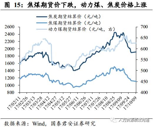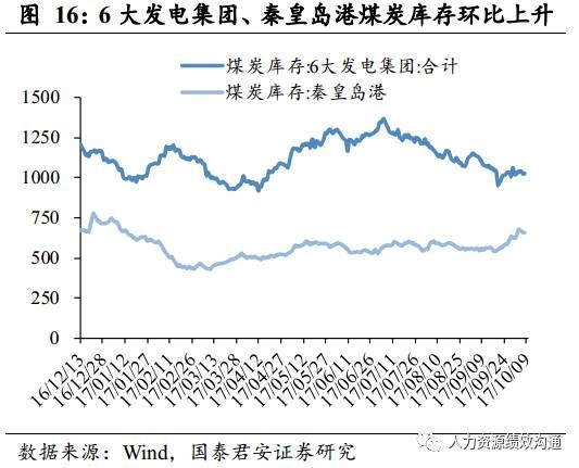 动力煤期货价格小幅回升,煤炭库存上升。(1)具体来看,10月9日,动力煤期货价格为626元/吨(上周625.6元/吨),环比上涨0.06%。而焦炭期货价格为1913元/吨(上周1900元/吨),环比上涨0.68%;焦煤期货价格1109.5元/吨(上周1125元/吨),环比下跌1.38%。(2)煤炭库存方面,10月9日,6大发电集团煤炭库存1046.21万吨,环比上升0.82%;秦皇岛港煤炭库存664万吨,环比上升2.31%。