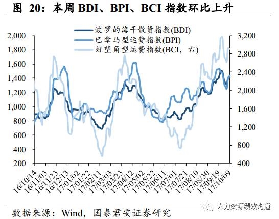 BDI、BPI、BCI指数环比上升。受运输铁矿石的海岬型船运价带动,10月2日至10月8日,BDI(波罗的海干散货指数)环比上升4.06%(上周下降11.64%),BPI(巴拿马型运费指数)环比上升6.14%(上周下降15.82%).BCI(好望角型运费指数)环比上升9.94%(上周下降15.82%).