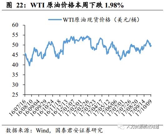 美元指数上涨0.1%,WTI原油现货价下跌1.98%。受9月飓风影响,美国9月非农就业人数下降3.3万人,远不及预期,且为2010年10月以来首次负增长,但失业率、薪资增速、劳动力参与率数据均有所改善,反映美国就业情况整体向好,就业人数下降不过是偶然事件带来的暂时性影响,并不会打击市场信心。美联储12月加息预期提升,短期内美元指数或持续性反弹。石油方面,美国原油产量提升,WTI原油价格周环比下跌1.98%。