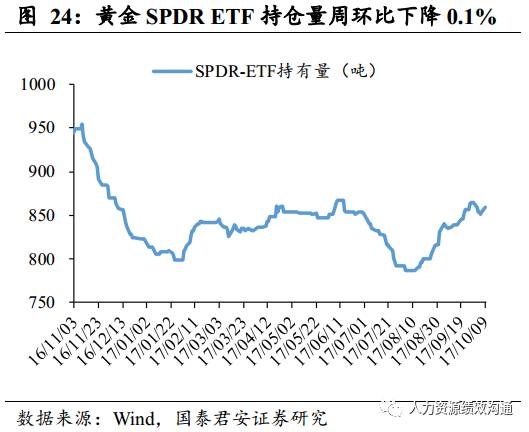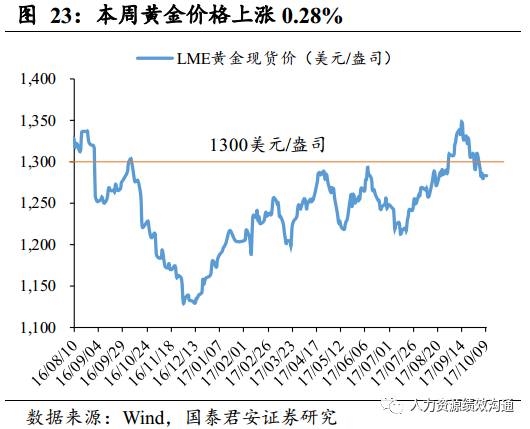 黄金价格上涨0.28%。黄金ETF持仓量周环比下降0.1%。近期美国经济数据表现突出,飓风造成的就业人数下降并未打击市场信心,美元持续性反弹。受美元走强影响,黄金价格高位回落。10月9日,黄金LME现货价格报收1283.33美元/盎司,环比小幅上涨0.28%, SPDR黄金ETF持仓量近几日有所回升,但周环比仍小幅下降0.1%至858.45吨。