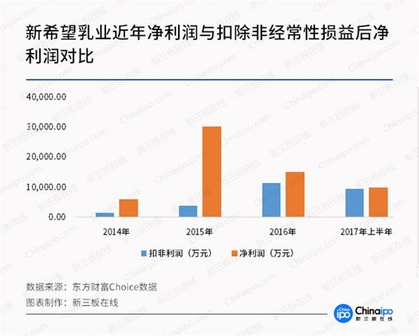 2015年、2016年和2017年上半年,新希望乳业扣除非经常性损益后的净利润分别为3770.71万元、11465.48万元和9519.43万元。上述三个报告期,公司扣非利润占净利润的比例分别为