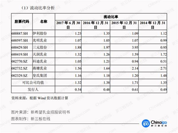 而在偿债能力指标上,新希望乳业对比同业公司差距更为巨大。财务数据显示,截至2017年上半年,公司流动比率为0.54,可比上市公司均值为1.32;速冻比率为0.45,可比上市公司均值为1.06。两项指标均远不及可比公司均值的一半。