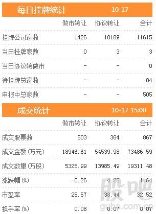 今日新增挂牌企业3家,截至2017年10月17日,挂牌企业总数达到11615家。