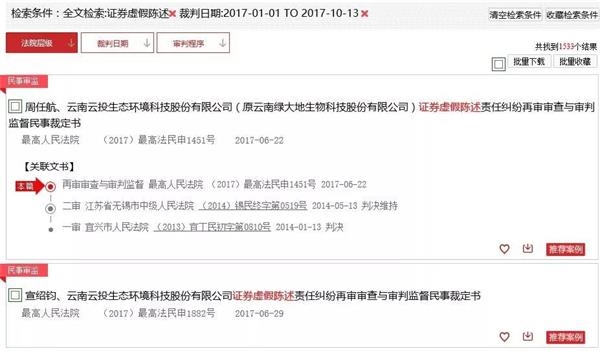 从更直观的方面来看,中国裁判文书网显示,截至10月13日16时,2017年因证券虚假陈述,而上诉的案件数为1533个,部分上述案件中,依据为证监会行政处罚认定书。