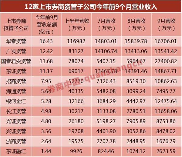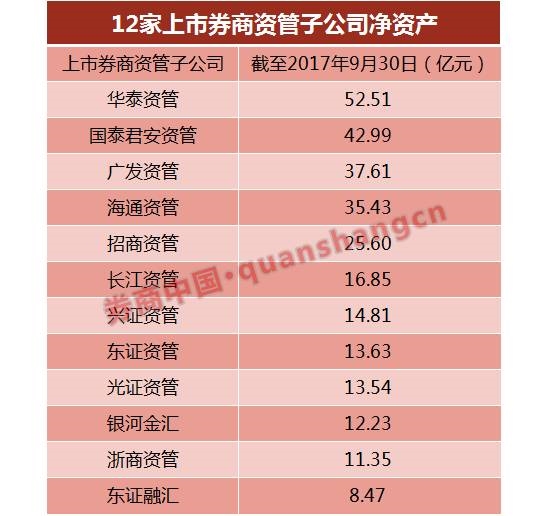 此外,截至今年9月30日,5家A股上市券商资管子公司净资产超过20亿元,华泰资管净资产最高,达52.51亿元。
