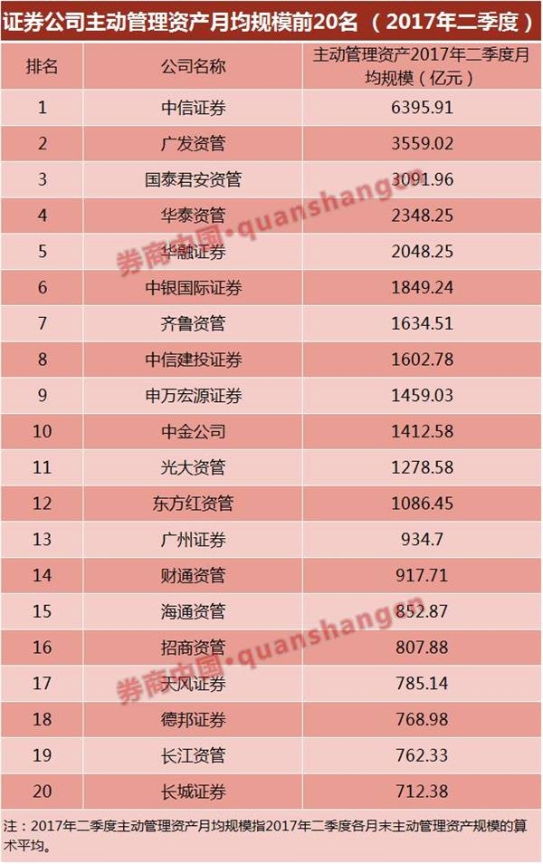中基协统计,截至今年二季度末,前20强券商主动管理资产月均规模合计约3.43万亿元。中信证券以6395.91亿元位列第一,紧随其后的是广发资管、国泰君安资管、华泰资管及华融资管,主动管理规模均在2000亿元以上。