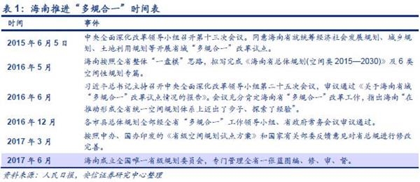 海南按照全省整体“一盘棋”思路,2016年5月拟写完成了《海南省总体规划(空间类2015—2030)》及6类空间性规划专篇。海南省“多规合一”改革随后获得了中央的充分肯定。