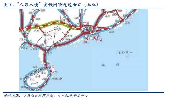 高铁过海:我国的高铁网络,正在由“四纵四横”向“八纵八横”升级,升级之后将基本覆盖中国人口20万以上城市。孤悬大陆的海南岛由于地理位置的原因长期游离于大陆的铁路网之外,交通不便势必极大的影响了岛内旅游业的发展。当前“八纵”规划中的包(银)海通道(包头~延安~西安~重庆~贵阳~南宁~湛江~海口(三亚)高速铁路)有望将高铁网络延伸至海南岛,并包括海南环岛高速铁路。据海口市交通运输和港航管理局近日在“问政海口”平台上对网友问题的答复:“中国铁路总公司于2017年9月15日至16日召开湛江至海安铁路扩能工程预可研审查会。根据本次会议精神,未来高铁过海倾向于高铁加轮渡的方式,高铁其他过海方式也在研究。”