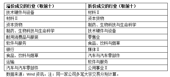 再来看看,大宗交易折溢价成交的情况在行业上的分布: