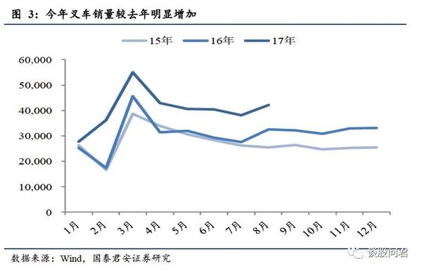 我国机械行业景气度较高,机械行业中报盈利增速较快。今年上游周期品涨价较多,但机械行业中报ROE环比依然改善,盈利维持了较快的增速,主要是因为销量的持续增加。挖掘机自去年下半年以来销量持续回暖,不止是挖掘机,叉车、起重机的销量也有所增加。