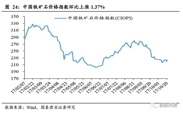 铁矿石价格上涨。10月14日至10月20日,中国铁矿石价格指数(CIOPI)上升至223.45,环比上涨1.37%。其中,国产铁矿石指数为218.12,环比下跌0.35%;进口铁矿石指数为224.25,环比上涨1.63%。